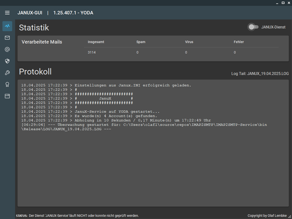 Mit der Software JANUX können Sie E-Mails von verschiedenen Mailservern (via IMAP, POP3 oder Microsoft Graph) abrufen und sicher an einen anderen Mailserver senden (per SMTP).